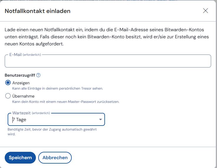 Die Funktion "Notfallkontakt" ermöglicht es Ihnen, vertrauenswĂŒrdigen Personen Zugriff auf Ihren Passwort-Tresor zu gewĂ€hren â im Ernstfall, z.âŻB. bei schwerer Krankheit, Unfall oder Todesfall. Sie definieren selbst, wer Zugriff bekommt und nach welcher Wartezeit dieser Zugriff automatisch gewĂ€hrt wird (z.âŻB. nach 7 Tagen, wenn Sie nicht widersprechen).