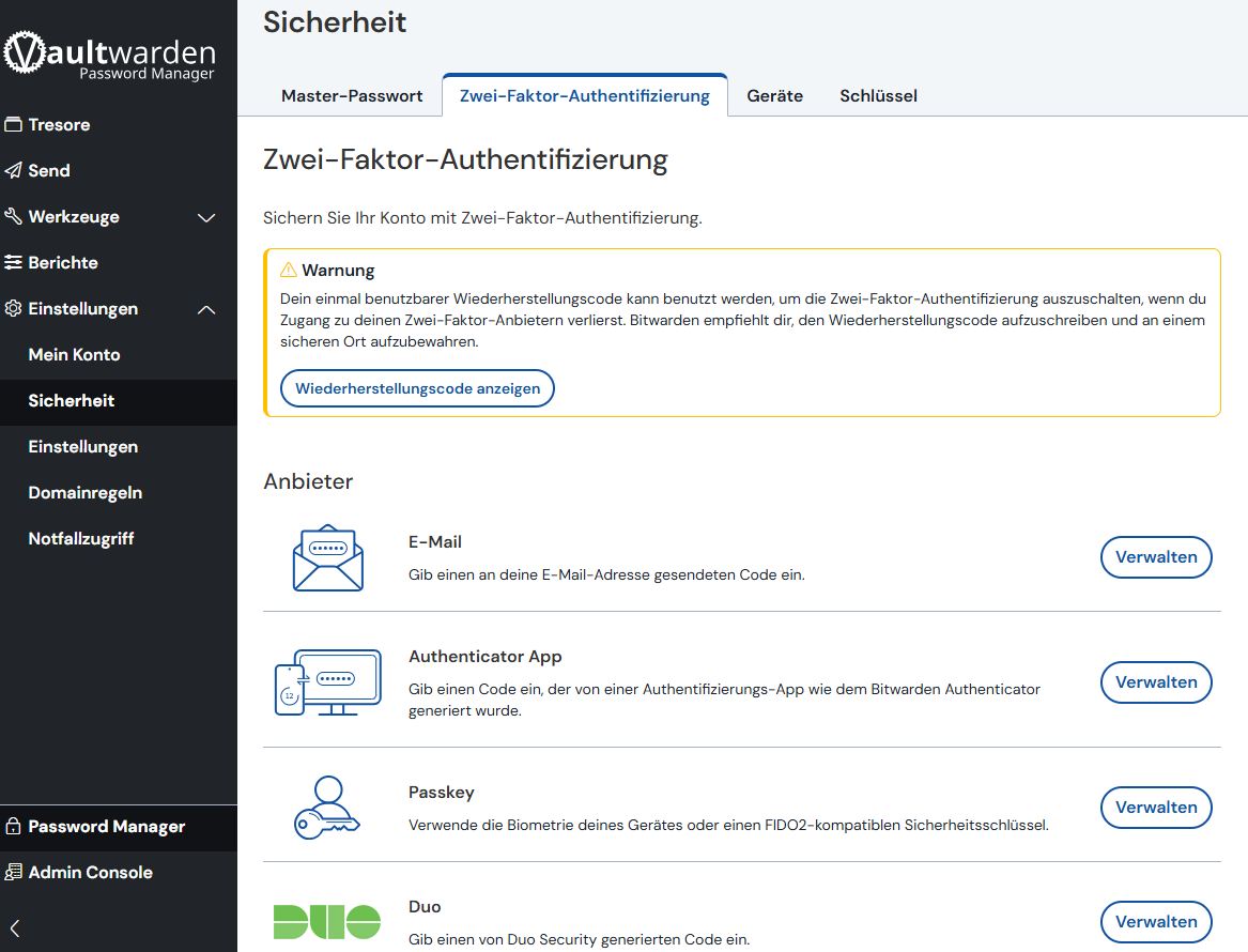 Die Zwei-Faktor-Authentifizierung fĂŒgt eine zweite Sicherheitsebene zu Ihrem Vaultwarden-Konto hinzu. Selbst wenn jemand Ihr Master-Passwort kennt, kann er sich ohne den zweiten Faktor nicht anmelden.