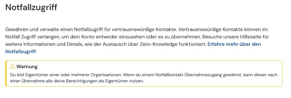 Die Funktion "Notfallkontakt" ermöglicht es Ihnen, vertrauenswĂŒrdigen Personen Zugriff auf Ihren Passwort-Tresor zu gewĂ€hren â im Ernstfall, z.âŻB. bei schwerer Krankheit, Unfall oder Todesfall. Sie definieren selbst, wer Zugriff bekommt und nach welcher Wartezeit dieser Zugriff automatisch gewĂ€hrt wird (z.âŻB. nach 7 Tagen, wenn Sie nicht widersprechen).