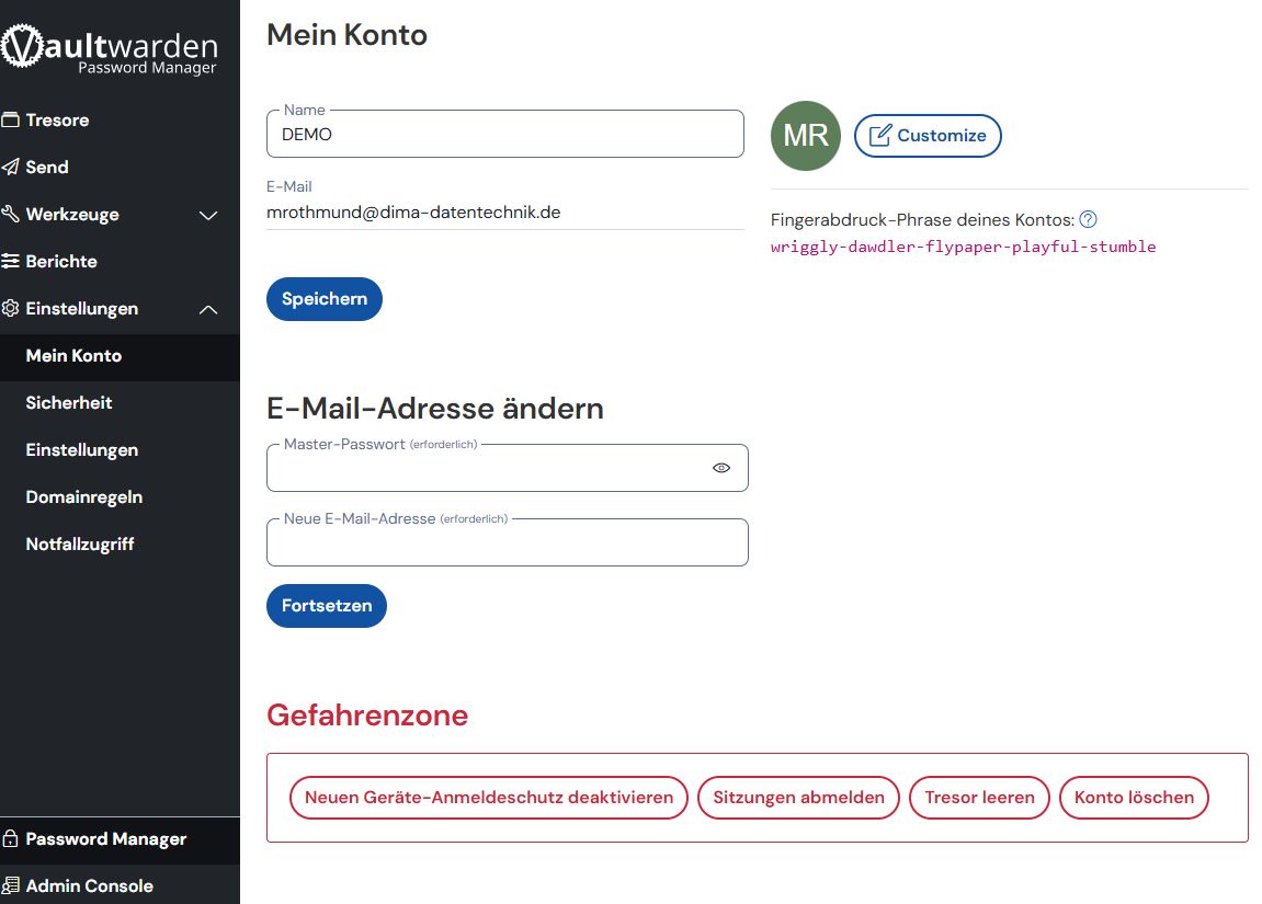 Im Bereich âMein Kontoâ â Gefahrenzone findest du in Vaultwarden einige kritische Funktionen, die starke Auswirkungen auf dein Konto haben. Dieser Bereich ist bewusst rot hervorgehoben, weil die Aktionen dort nicht rĂŒckgĂ€ngig gemacht werden können oder wichtige Sicherheitsfunktionen betreffen.